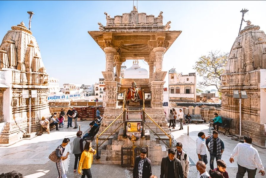 Далее наш путь лежит в храм Джагдиша, возвышающийся немного к северу от Городского Дворца. Построенный в 1652 году, храм посвящен Вишну, его внешние стены украшены резьбой с фигурами бога, сценами из жизни Кришны. Просторный холл - мандапа ведет к святилищу, в котором находится статуя Джаганатха из черного вулканического камня. В маленьком приподнятом алтаре перед храмом стоит бронзовое изображение Гаруды, воздушное средство передвижения бога Вишну.