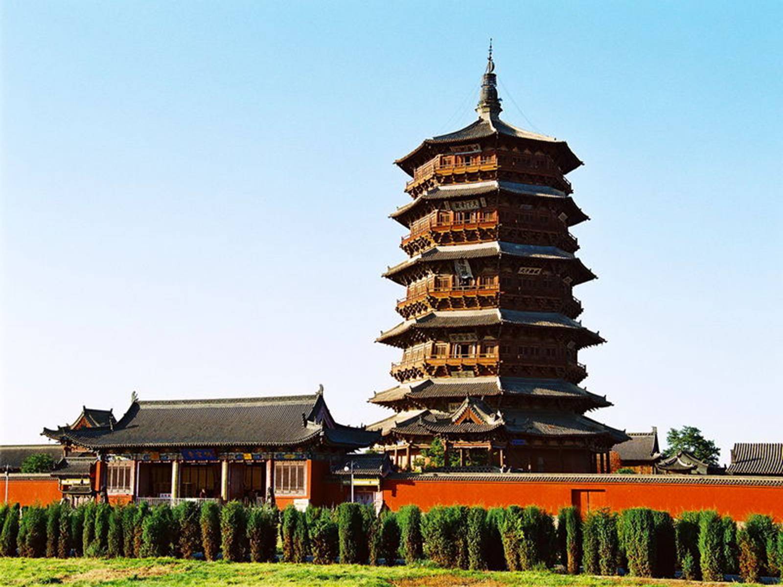 Она была построена при династии Ляо (907-1125 гг.). Это самая древняя и высокая деревянная пагода в мире Ее высота составляет 67.13 и она на 115 лет старше Пизанской башни в Италии, высота которой 54,56 м. Девятиярусное сооружение имеет восьмиугольную форму и примечательно еще и тем, что древние мастера построили ее без единого гвоздя. Каждый ярус поддерживается балками, которые покоятся на парных столбах, идущих по окружности. Перекладины, связующие столбы, образуют разнообразный узор. Пагода имеет строго выдержанную и тщательно продуманную конструкцию нее девять внутренних этажей, хотя снаружи кажется, что этажей только пять.