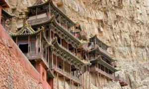 Висячий Монастырь (ЮНЕСКО): висячий храм Сюанькунсы интересен не масштабными размерами, а уникальной конструкцией и невероятным расположением. В переводе с китайского название монастыря Сюанькунсы переводится как "храм, который висит в воздухе". Он действительно построен на небольшом уступе в горном ущелье, на высоте 50 метров от земли.