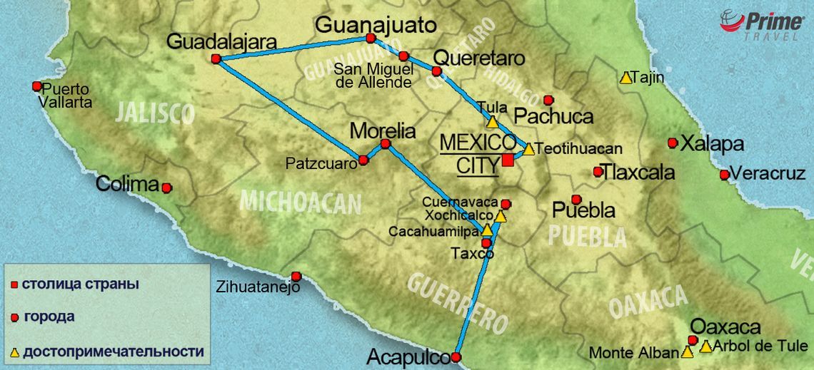 "Романтическая Мексика" – это путешествие по святым местам доколумбовой, колониальной и современной Мексики. Тула, Керетаро, Сан Мигель де Альенде, Атотонилько, Гуанахуато, Гвадалахара и Морелия! Маршрут этой экскурсионной программы проложен через самые уникальные места от пирамид Теотиуакана до самого Акапулько!