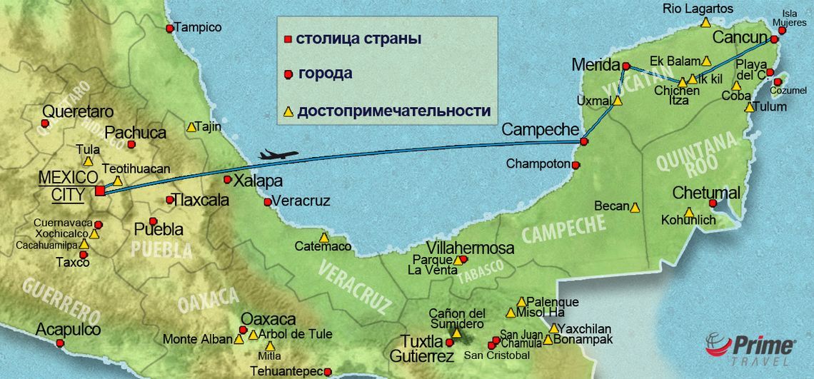 Гарантированный экскурсионный тур в Мексике «Загадки Ацтеков и Майя» - это уникальная возможность всего за 6 дней окунуться в историю двух величайших культур доколумбовой эпохи – ацтекской и майянской. Приблизиться к истокам этих культур Вам поможет посещение Национального антропологического музея, исторического центра Мехико и древних городов, таких как Теотиуакан, Ушмаль, Чичен-Ица, Кампече и Мерида. Многие из этих мест находятся под защитой ЮНЕСКО. И, наконец, в заключение поездки Вас ждут природные красоты подземного озера и бирюзовых вод Карибского моря.