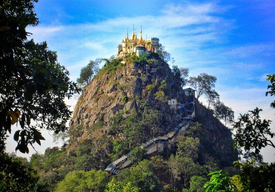 Гора Попа представляет собой потухший вулкан, на одной из скал которого находится священный монастырь Таунг Калат. Монастырь считается домом для 37 бирманских натов (или духов). К монастырю ведет 777 ступеней и, преодолев этот путь, Вы сможете насладиться захватывающей дух панорамой.