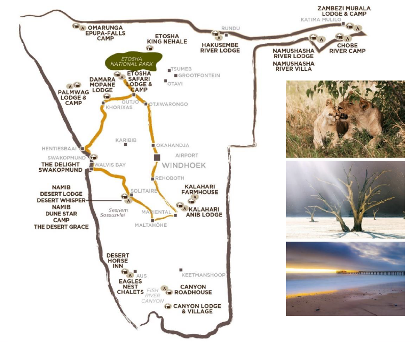 Приглашаем Вас посетить следующие места: национальный парк Этоша, где дикие животные бродят по белым соляным впадинам, песочный океан долины Соссусфлей, пустынные пляжи холодного Атлантического океана и мистический регион Кунене.