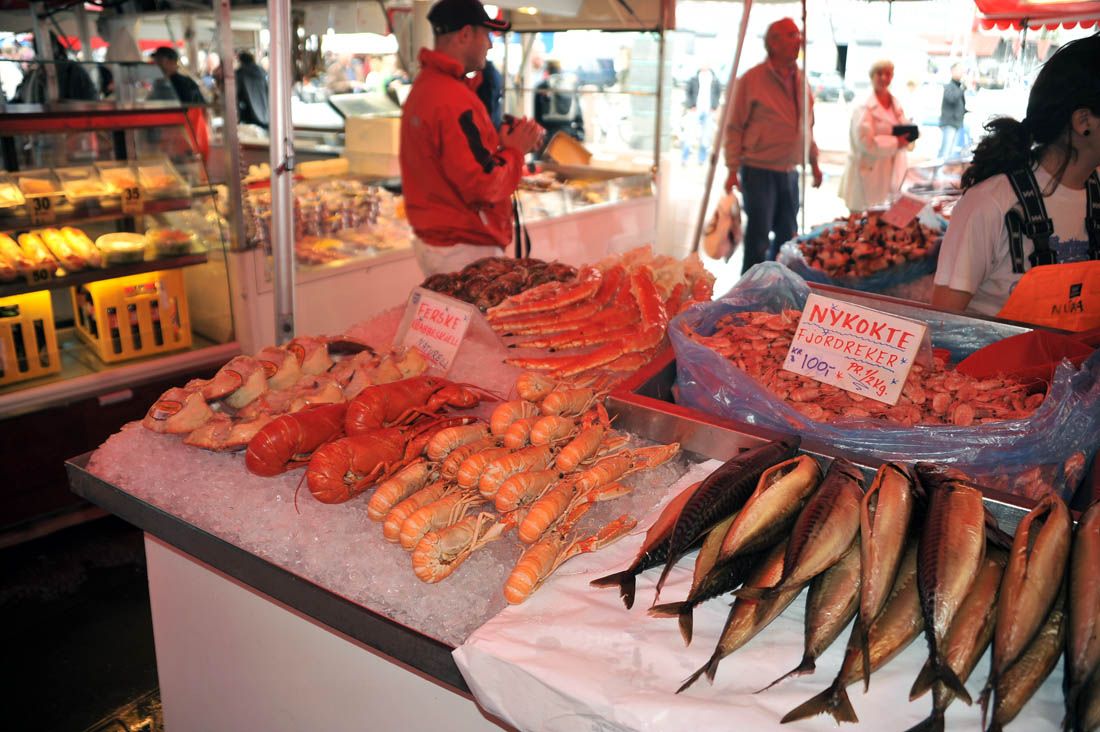 - На рыбном рынке Бергена можно купить и отведать свежайшие морепродукты.