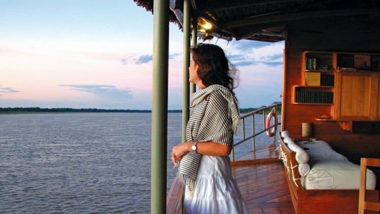 Как только яхта отчалит от берега, стоит подняться на третью палубу, где можно наслаждаться открывающимися видами. Здесь гид расскажет о маршруте, экскурсиях и мероприятиях, местной природе и растительности. Его наметанный глаз быстро выхватывает тропических птиц и обезьян среди зарослей, так что бриф превратится в увлекательное мероприятие, которое закончится первым красивейшим закатом на Амазонке. Вечером приветственный ужин в ресторане.