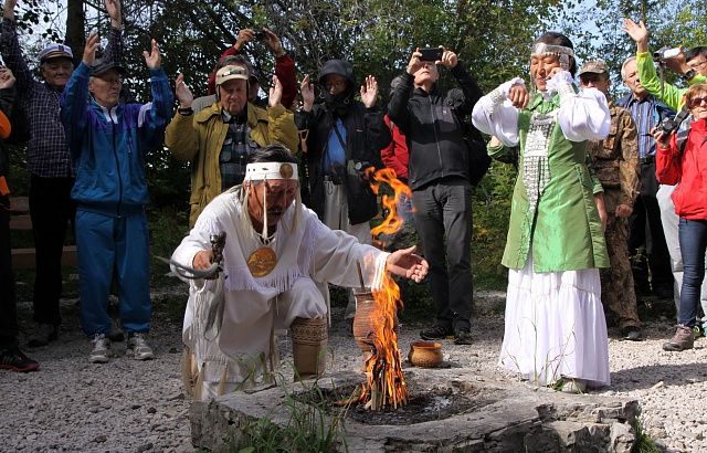 После приветственной церемонии с ритуальными танцами и обрядом «Очищение огнем» - вперед на скальный массив (путешествие для крепких и выносливых!). Ощущения там, наверху, непередаваемые. С вершины одной из «башен» открывается грандиозная панорама великой реки, бескрайней тайги, скал и неба самых разных оттенков, заставляющая зрителя почувствовать себя частичкой первозданной природы и огромной Вселенной.