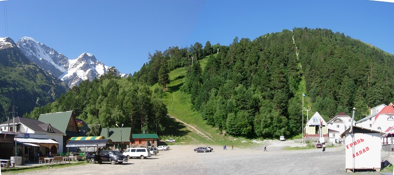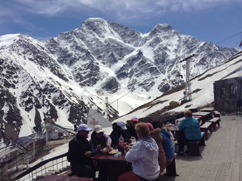 В 14.30 наш транспорт отправляется к подножию Эльбруса: на поляну Чегет, расположенную на высоте около 2100 метров над уровнем моря в посёлке Терскол. Расстояние составляет 185 км, время в пути - около 3 часов.