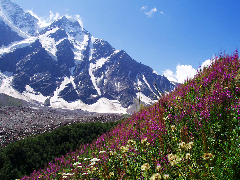 Прогуливаясь по ущелью вдоль реки Терскол, вы сможете полюбоваться знаменитым ледником Терскол, вершиной горы Донгуз-Орун, ледником Семерка. Тропинка вьется вдоль живописной горной речки. Постепенный подъем позволяет насладиться прекрасными видами почти без усилий, и в конце откроется гудящий поток чистой ледниковой воды.